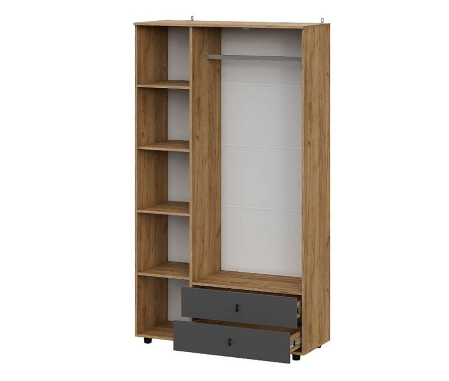 Фасады МДФ: Графит Корпус ЛДСП: Дуб золотой Ручки: чёрные матовые Петли с доводчиком Шариковые направляющие Геометрическая фрезеровка Шкаф распашной трехстворчатый с двумя ящиками на шариковых направляющих. Створки и накладки из МДФ с фрезеровкой в пленке ПВХ.В левой части шкафа расположен отсек с четырьмя полками (одна стационарная и три съемных), в правой части шкафа расположен отсек со штангой (присадка под штангу отсутствует, покупатель устанавливает ее самостоятельно), под которым установлены два выкатных ящика. Габариты модуля (ШхВхГ): 1200х2106х464 мм Фасады накладные