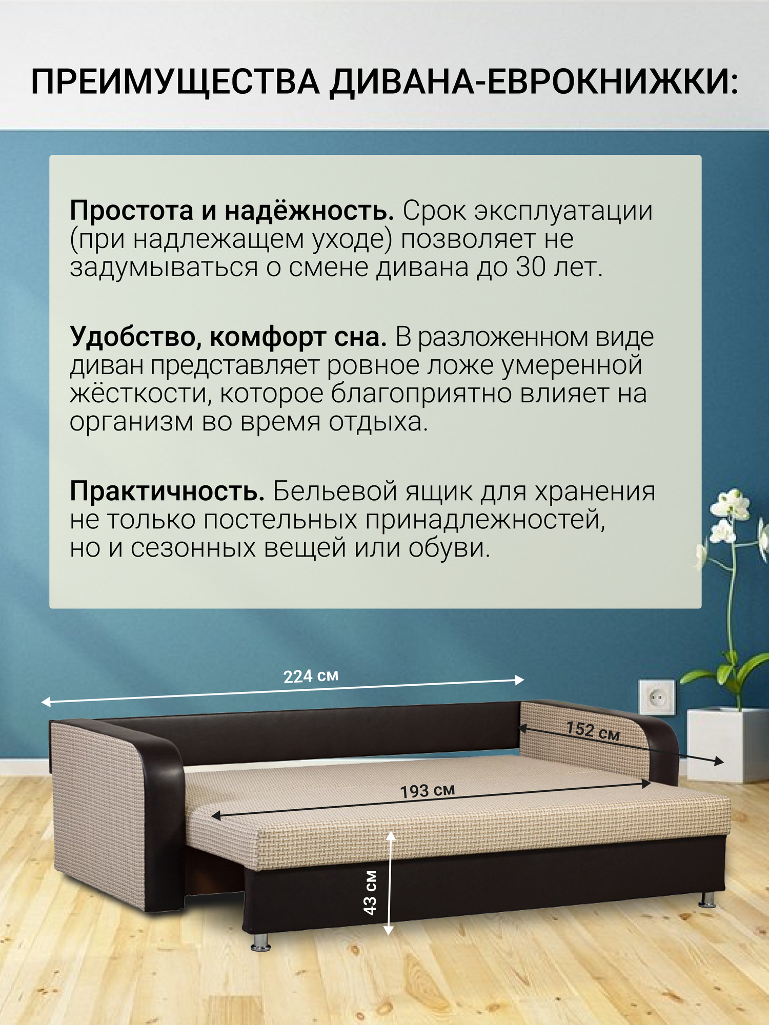 Диван «Юпитер 2» - классический представитель моделей диванов типа «еврокнижка». Он оснащен выдвижным сиденьем, задней спинкой, подлокотниками и подушками. При раскладывании такой диван превращается в полноценную кровать для двух человек. «Еврокнижку» можно считать одним из самых прочных и долговечных механизмов трансформации, так как в нем присутствует минимум деталей. Диван мебельной фабрики «Галакси» будет радовать своих хозяев долгие годы: смотрите на нём телевизор, читайте книги, играйте с детьми, а вечером превратите в комфортную кровать. Дополнительный ящик для белья позволит Вам сэкономить место для хранения в шкафу.