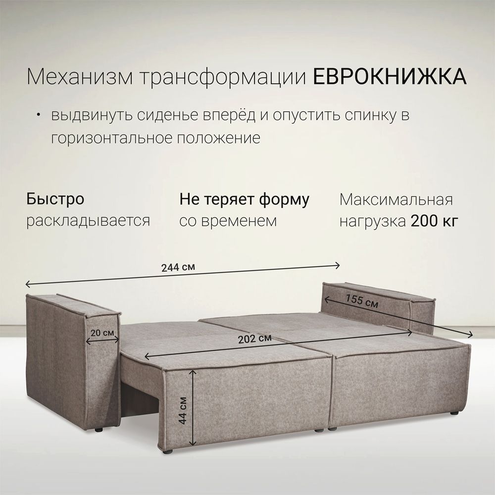 - Удобная трансформация: Механизм «Еврокнижка» быстро превращает диван в полноценную кровать с размерами 200×155 см, идеально подходящую для отдыха или ночлега.