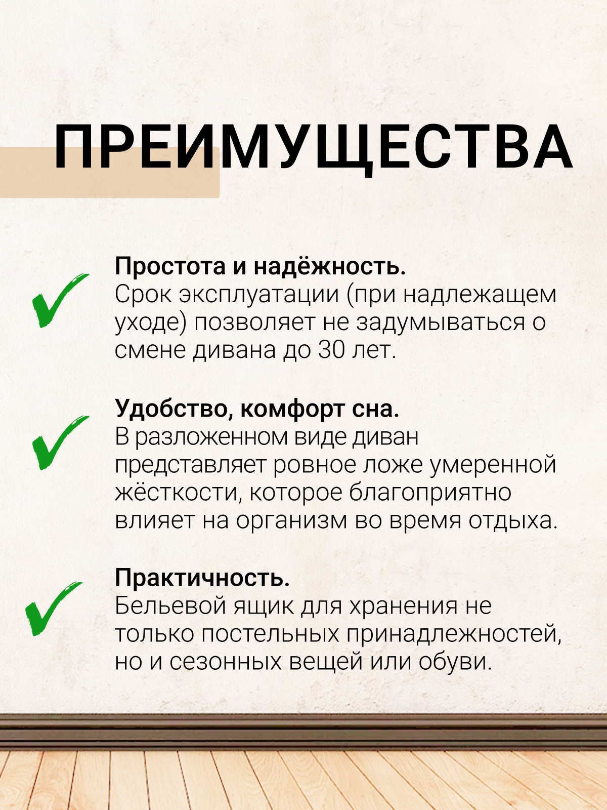 Благодаря своим компактным размерам, диван-кровать "Юпитер" отлично впишется даже в небольшое пространство, не занимая лишнего места. Также, стоит отметить, что диван оснащен удобным складным механизмом, который позволяет легко и быстро преобразовать его в полноценное спальное место и обратно.