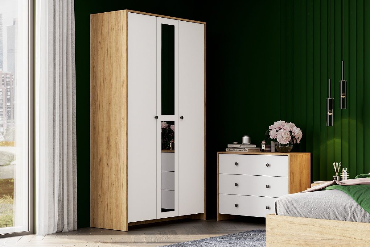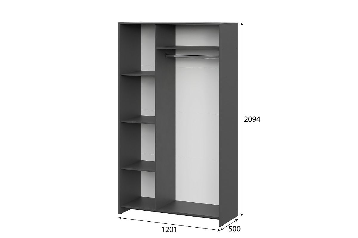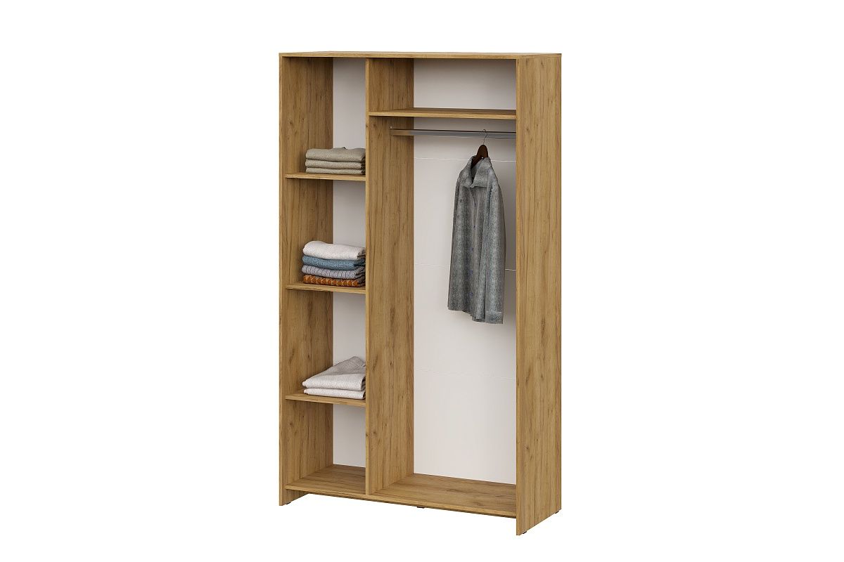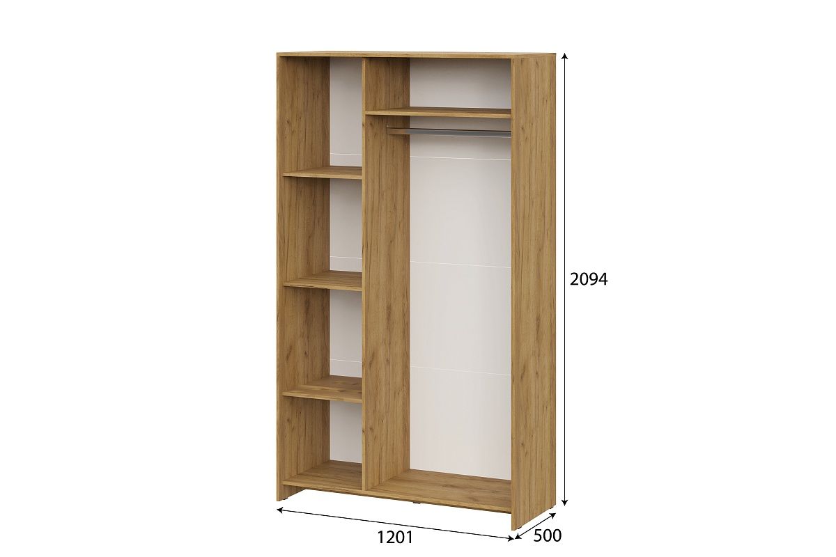 Его размеры: высота — 209,4 см, ширина — 120,1 см, глубина — 50 см. Внутри шкафа есть 3 полки для белья и одна для хранения и продольная штанга для одежды. Характеристики: Цвет корпуса - Дуб Золотой Цвет фасада - Белый Материал: ЛДСП, зеркало Задние стенки из ЛДВП - 3 мм. Штанга для белья - Да Расположение полок - 3 полки слева, 1 полка справа Максимальная нагрузка на каждую полку - 5 кг.