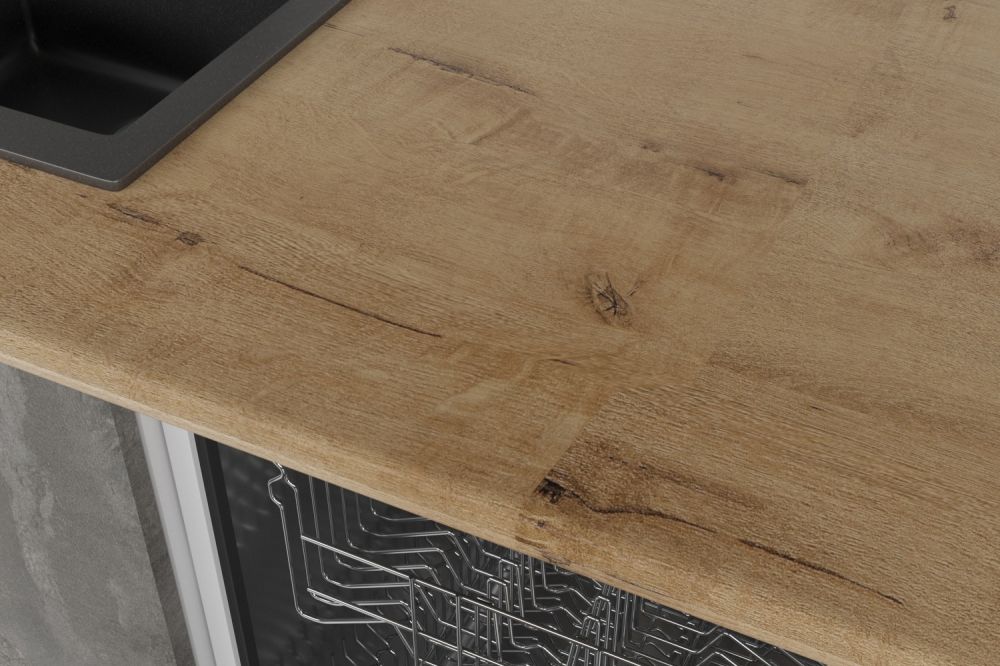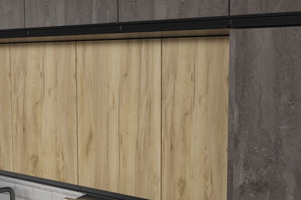 Дизайн и Цветовое решение: Модель выполнена в премиальном контрастном сочетании, которое сейчас на пике популярности. Темный низ (фасады Бетон темный) создает ощущение надежности и базы, а светлый верх (фасады Дуб золотой) наполняет кухню воздухом и светом. Корпус цвета Венге придает глубину всей конструкции, а столешница Дуб бунратти завершает композицию, добавляя натуральную текстуру дерева. Ручка-профиль подчеркивает современные линии фасадов.