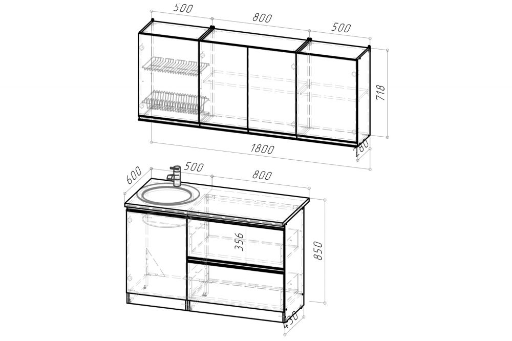 В базовый комплект поставки входят корпусная мебель и фурнитура. Мойка, смеситель, стеновая панель (фартук) и посудосушитель приобретаются отдельно — это позволяет вам выбрать именно те аксессуары, которые подходят под ваш стиль и бюджет.