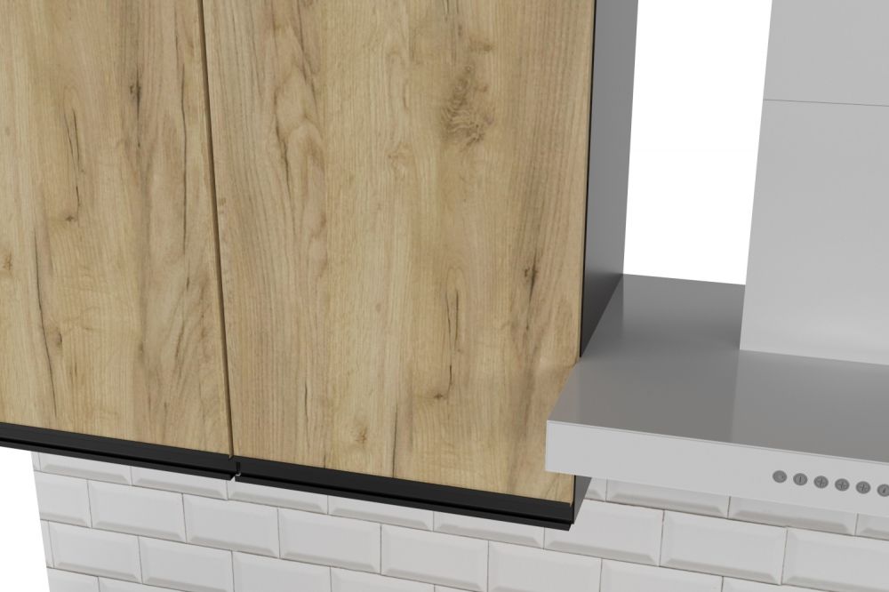 Дизайн и Цветовое решение: Модель выполнена в премиальном контрастном сочетании, которое сейчас на пике популярности. Темный низ (фасады Бетон темный) создает ощущение надежности и базы, а светлый верх (фасады Дуб золотой) наполняет кухню воздухом и светом. Корпус цвета Венге придает глубину всей конструкции, а столешница Дуб бунратти завершает композицию, добавляя натуральную текстуру дерева. Ручка-профиль подчеркивает современные линии фасадов.