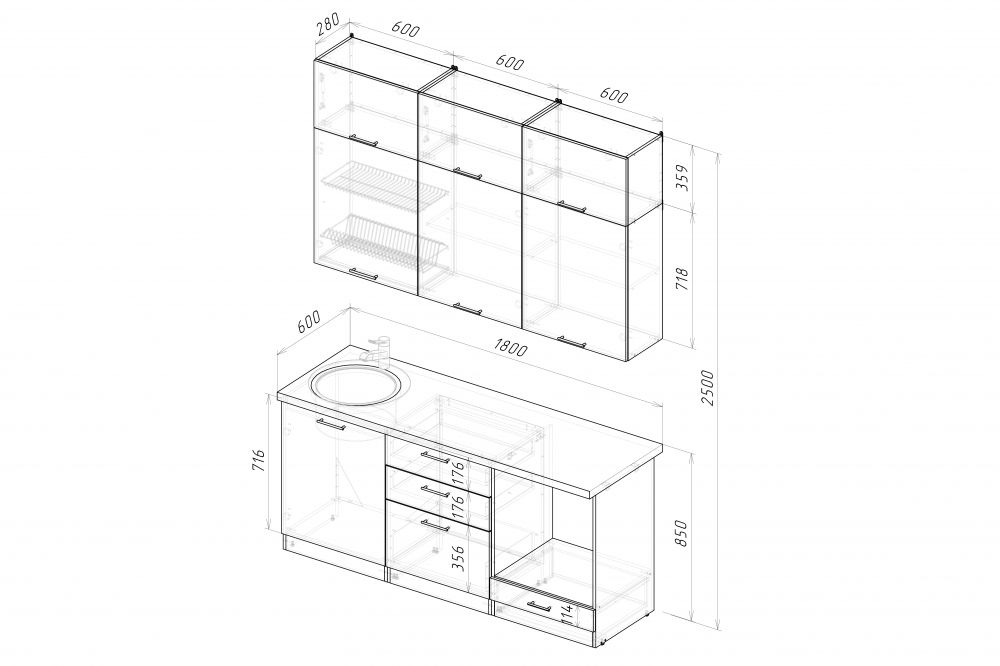 Мойки, смесители, стеновые панели, посудосушители, варочные панели, духовые шкафы, плиты, вытяжки в комплекты гарнитуров не входят.