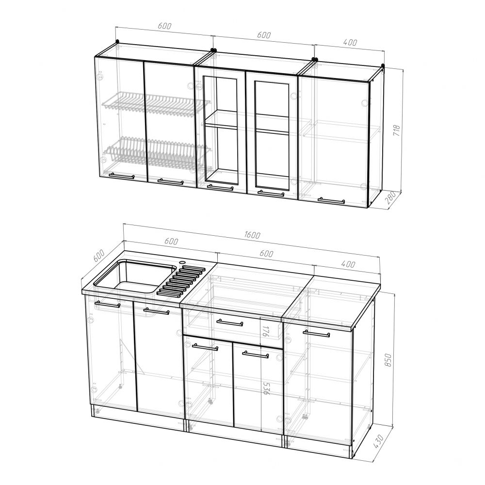Ширина, мм-1600 Глубина, мм-600 Высота столов, мм-850 Высота шкафов, мм-720