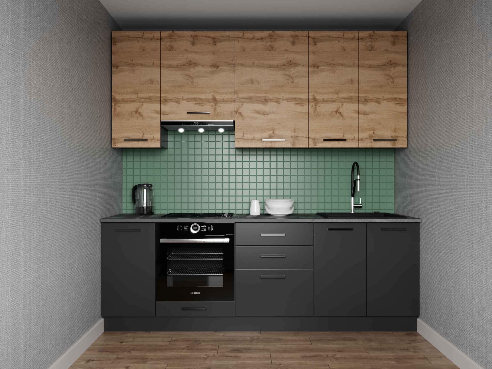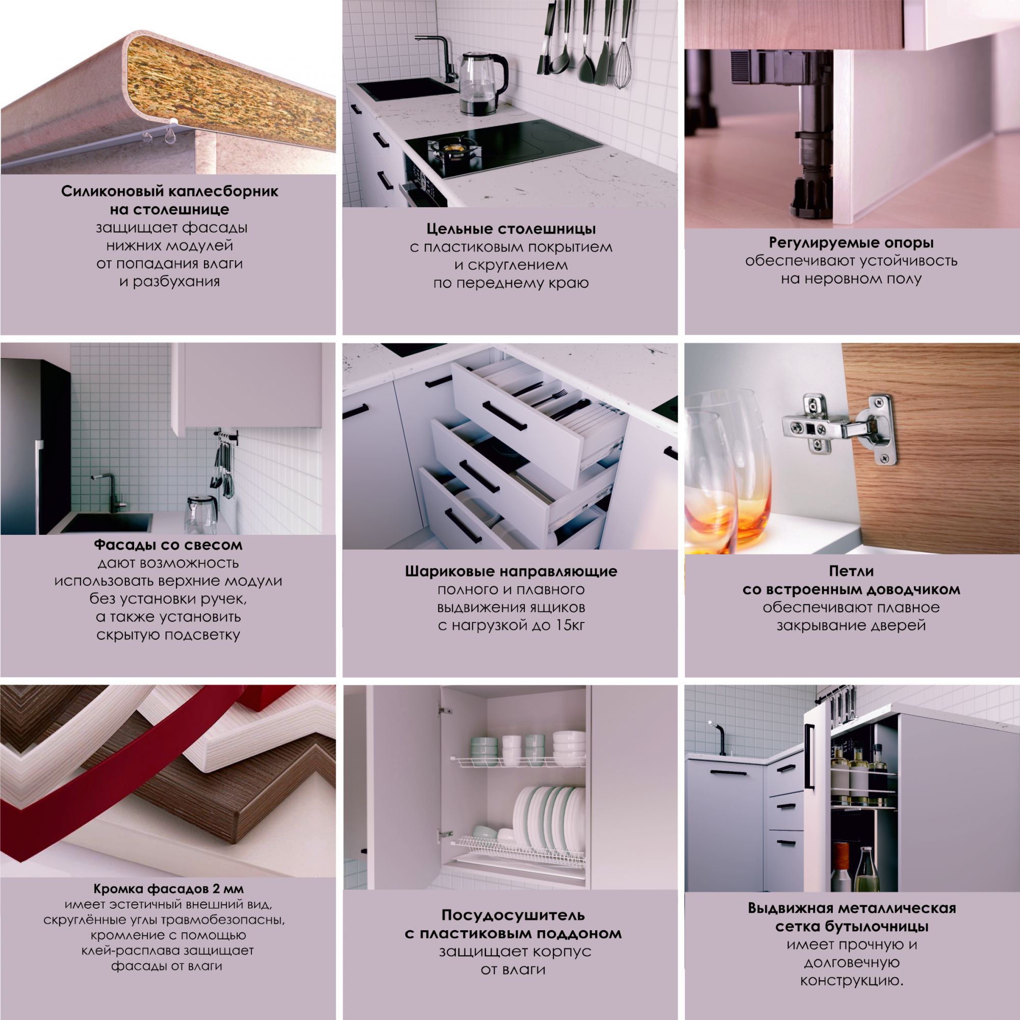 Фасады ЛДСП 16 мм, кромка ПВХ 1мм.Фасады верхних модулей со свесом 12 мм дают возможность использовать без установки ручек. Петли с доводчиком. Навесы внутренние, регулируемые, с декоративной крышкой. Направляющие шариковые полного, плавного выдвижения с нагрузкой до 30 кг.