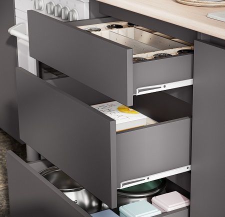 - Направляющие ящиков — роликовые.