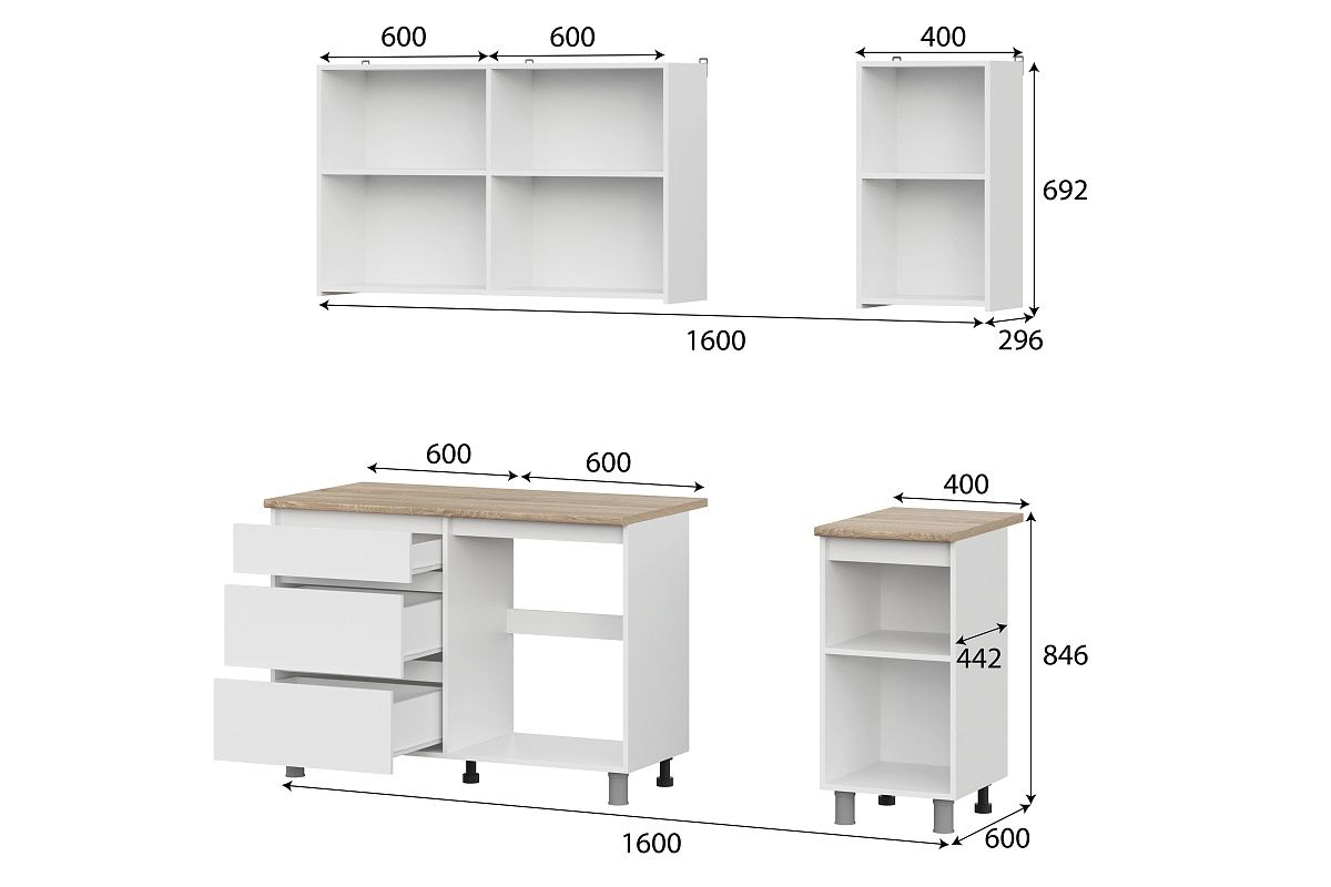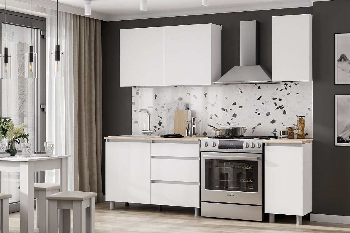 Кухонный гарнитур Den 1,6м выполнен в современном стиле лофта с контрастными акцентами белого корпуса и светло-коричневой столешницы. Прямая форма обеспечивает оптимальное использование пространства даже в небольших помещениях.