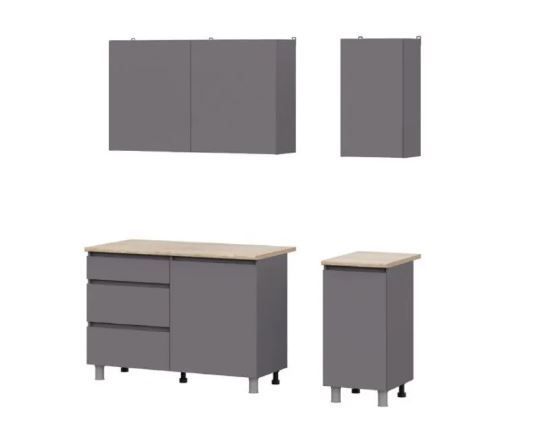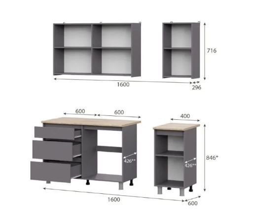 Гарнитур универсально подходит для кухни или студии, легко собирается из комплектующих. Совместимость с врезной мойкой уже учтена в конструкции.