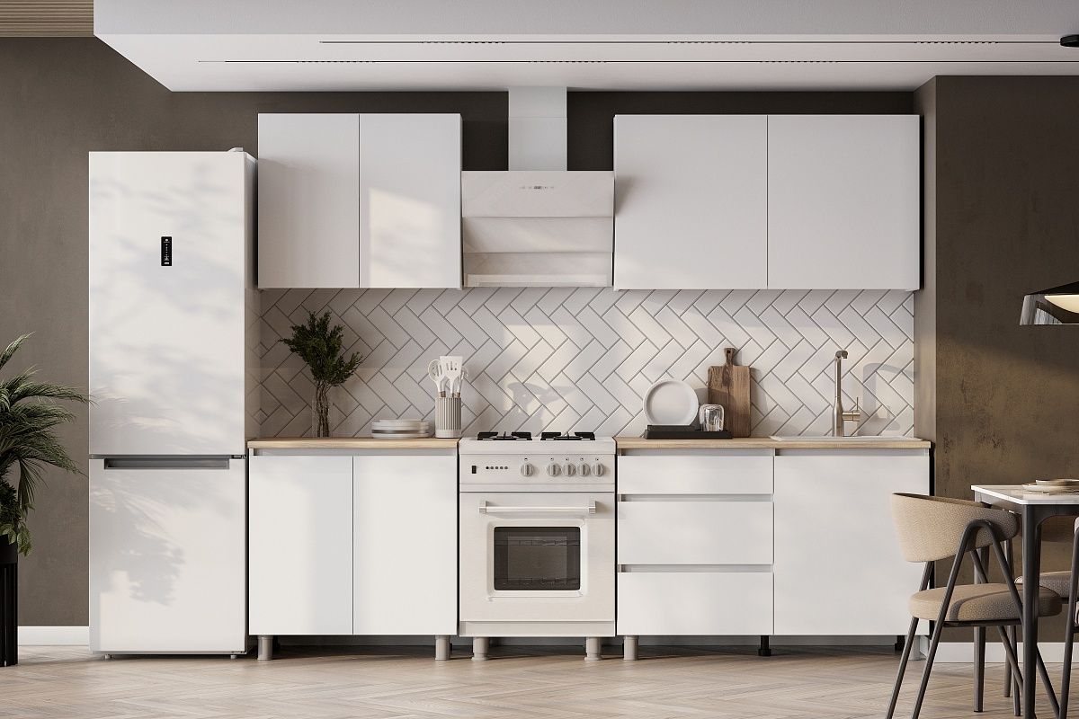 Фасады шкафов и столов не имеют ручек и скосов - это тренд на рынке кухонных гарнитуров.