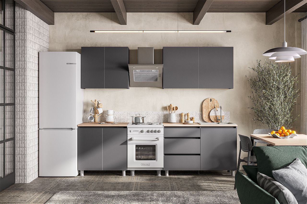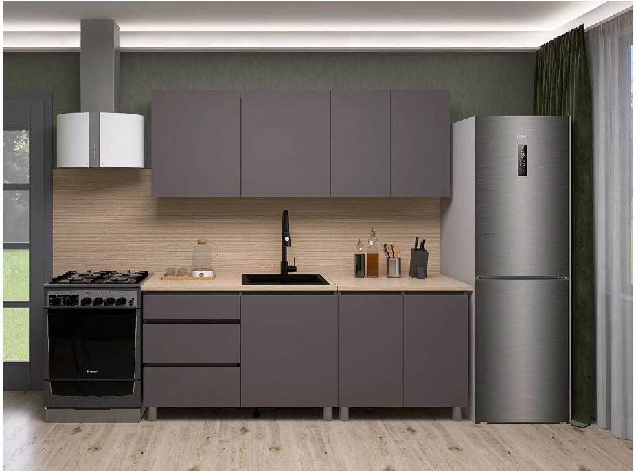Просторный прямой гарнитур с современным дизайном идеально впишется в кухню любого формата. Корпус и фасад выполнены из прочного ЛДСП с матовым ламинированным покрытием, обеспечивающим долговечность и легкость в уходе. Комбинирование графитового серого цвета корпуса и теплых оттенков дуба Сонома на столешнице добавляет интерьеру контрастности и стиля.