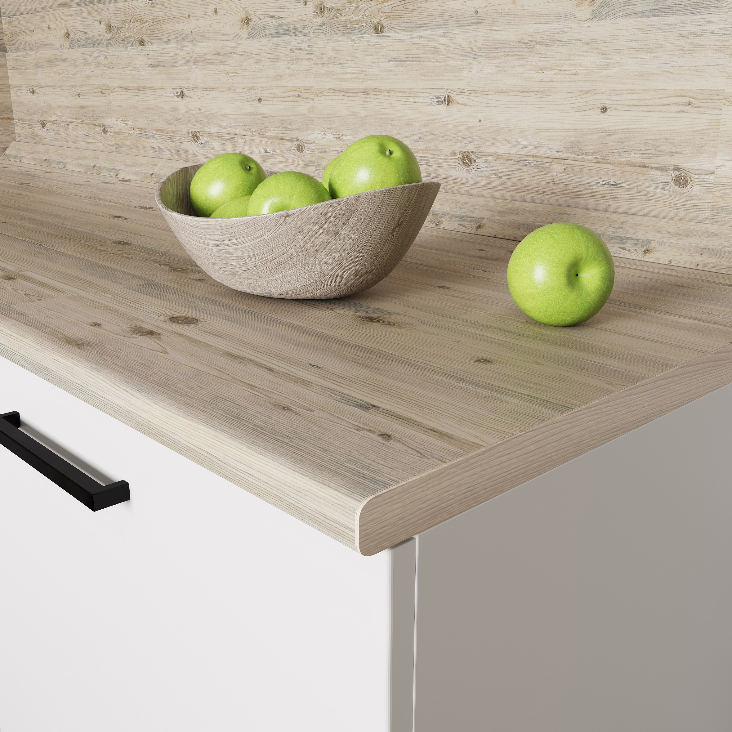 Столешницы цельные, с пластиковым покрытием со скруглением по переднему краю (постформинг толщиной 26/38 мм).