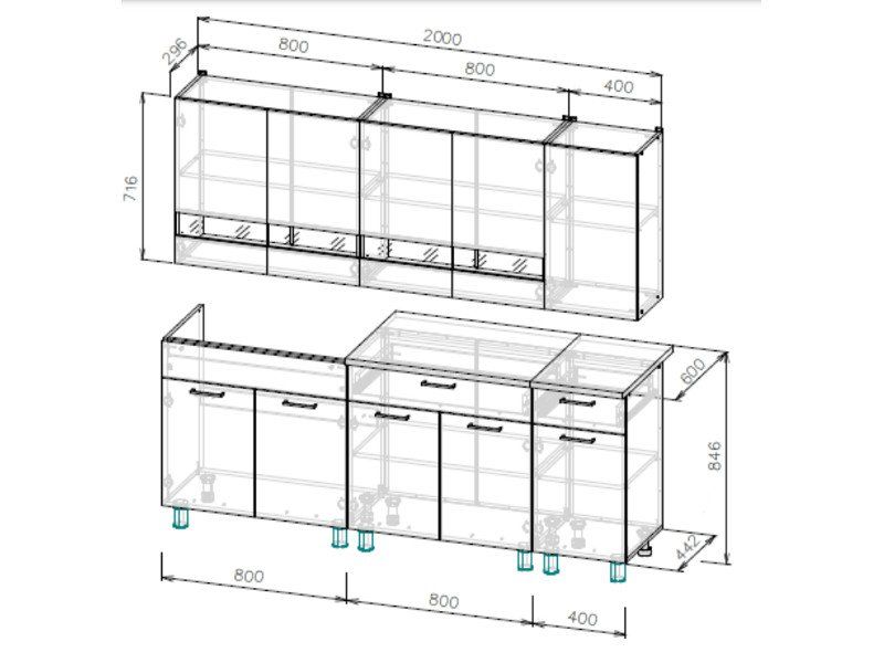 - Нижние модули (ВхГ) 846х442(по столешнице 600) мм: М600, С800, С400яс.