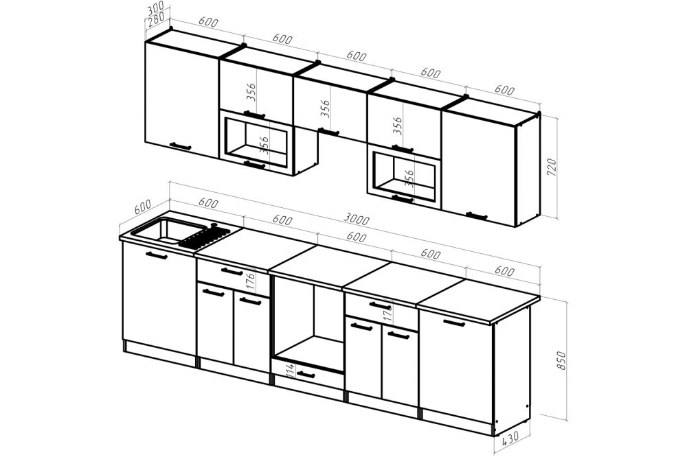 *Мойка, смеситель, посудосушители, стеновая панель, бытовая техника, подсветка в комплект не входят, их необходимо приобрести отдельно.