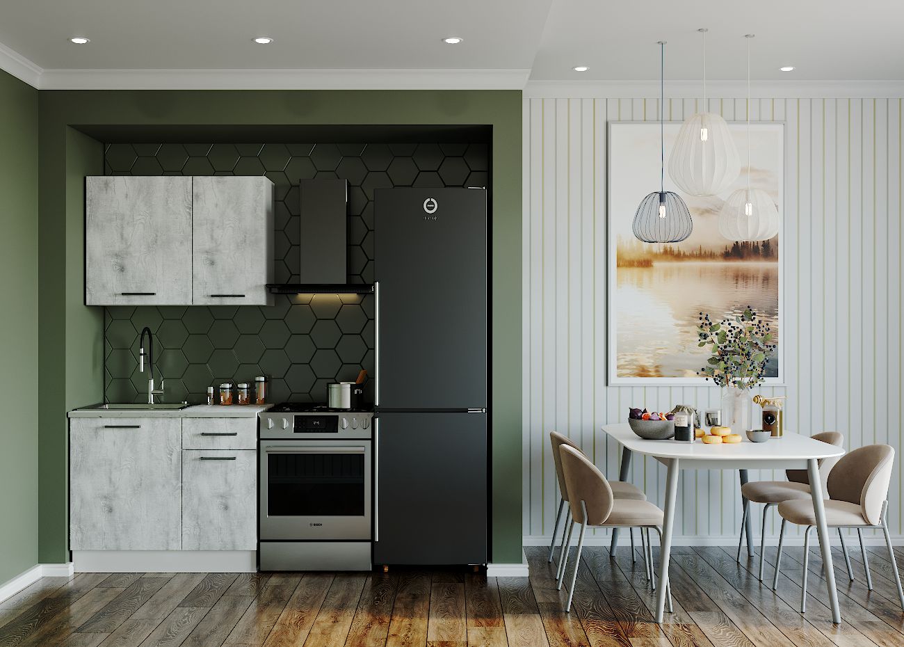 Мойка, смеситель, стеновая панель, бытовая техника в комплект не входят.