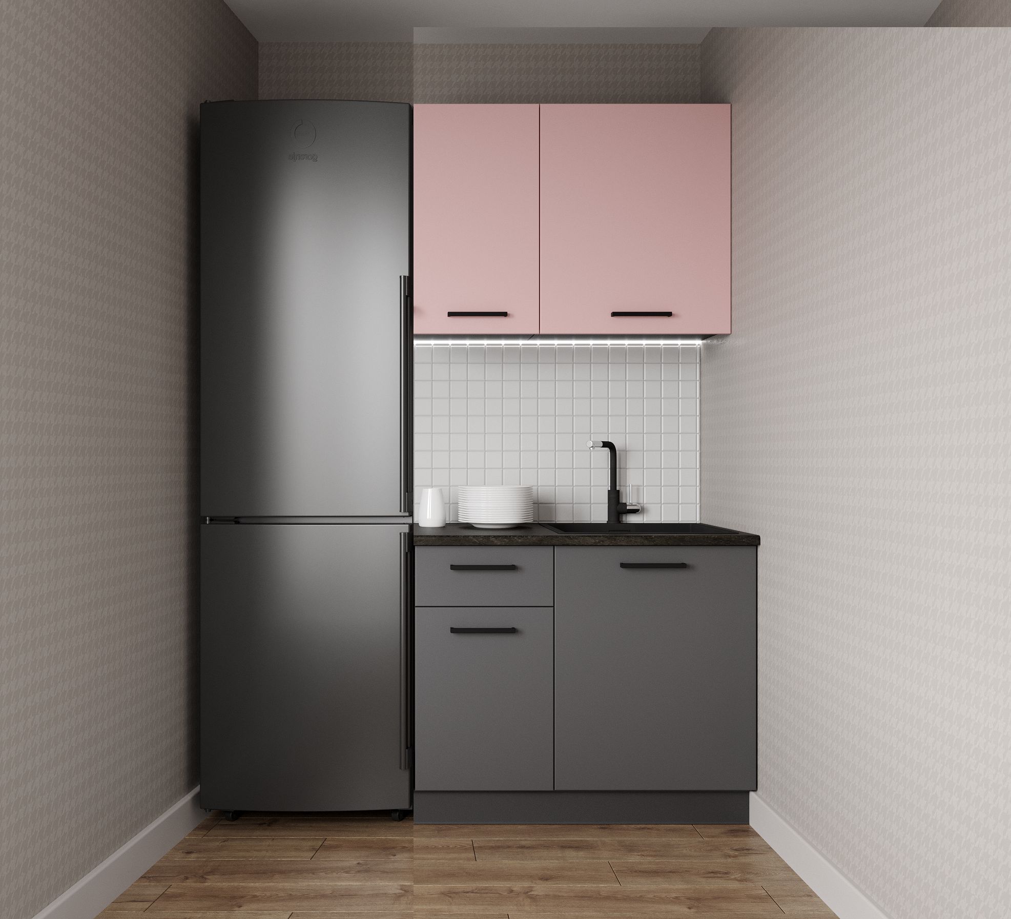 Мойка, смеситель, стеновая панель, бытовая техника в комплект не входят.