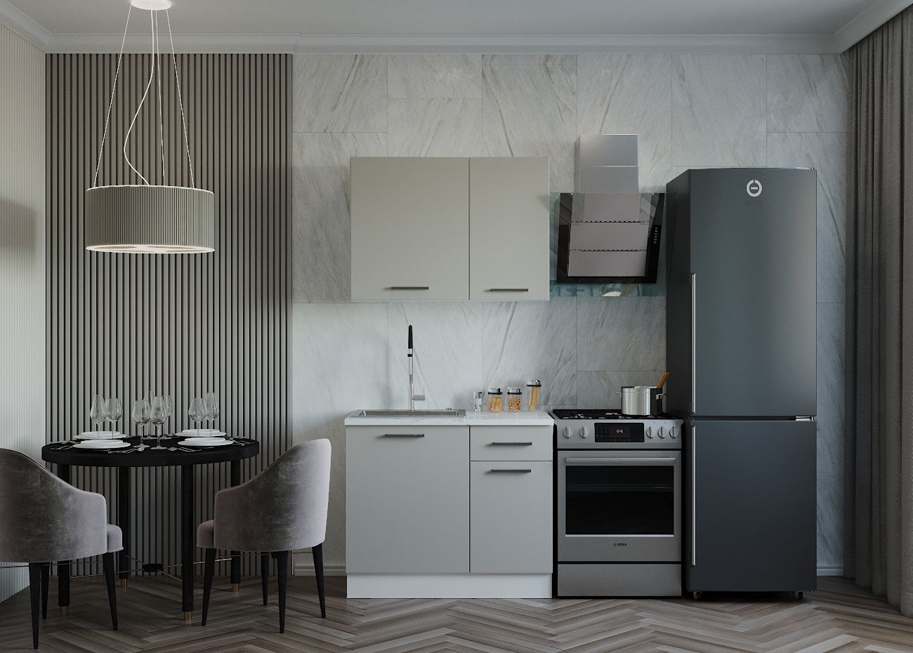 Мойка, смеситель, стеновая панель, бытовая техника в комплект не входят.
