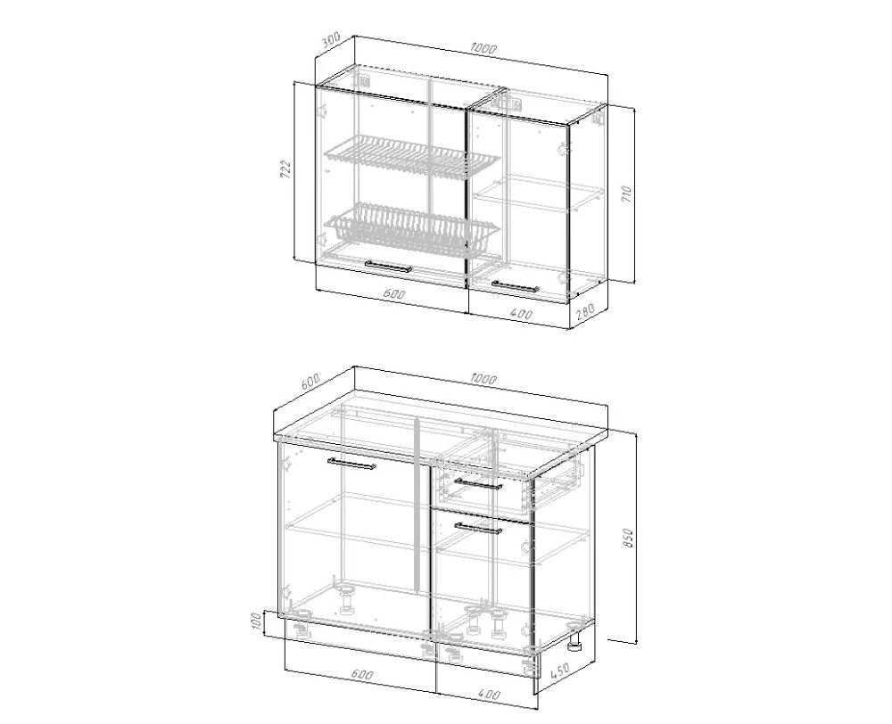 Кухонные модули, цоколь на каждый модуль, посудосушитель, столешница без выпилов, комплект фурнитуры, инструкция по сборке.