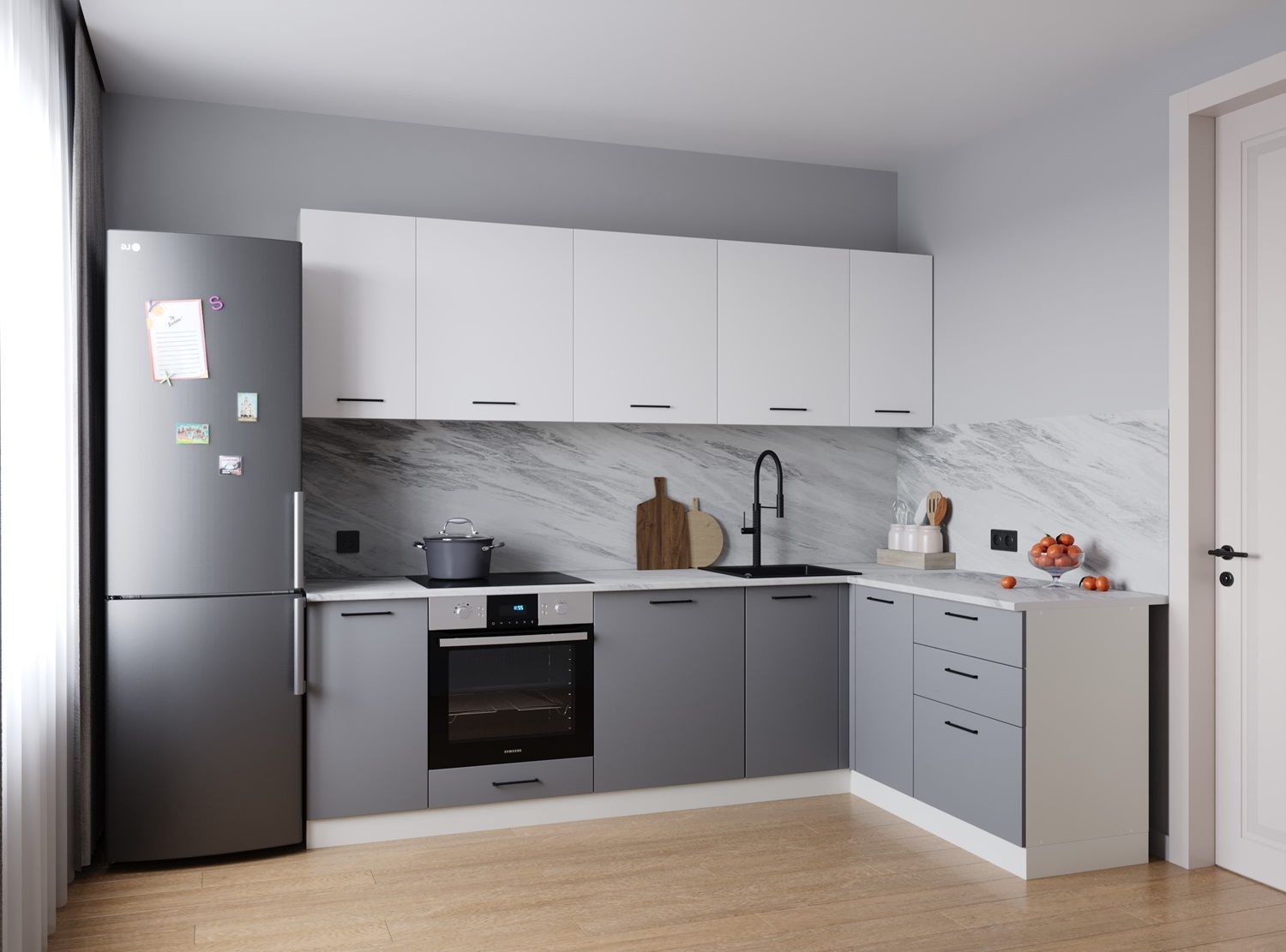 Мойка, смеситель, стеновая панель, бытовая техника в комплект не входят.