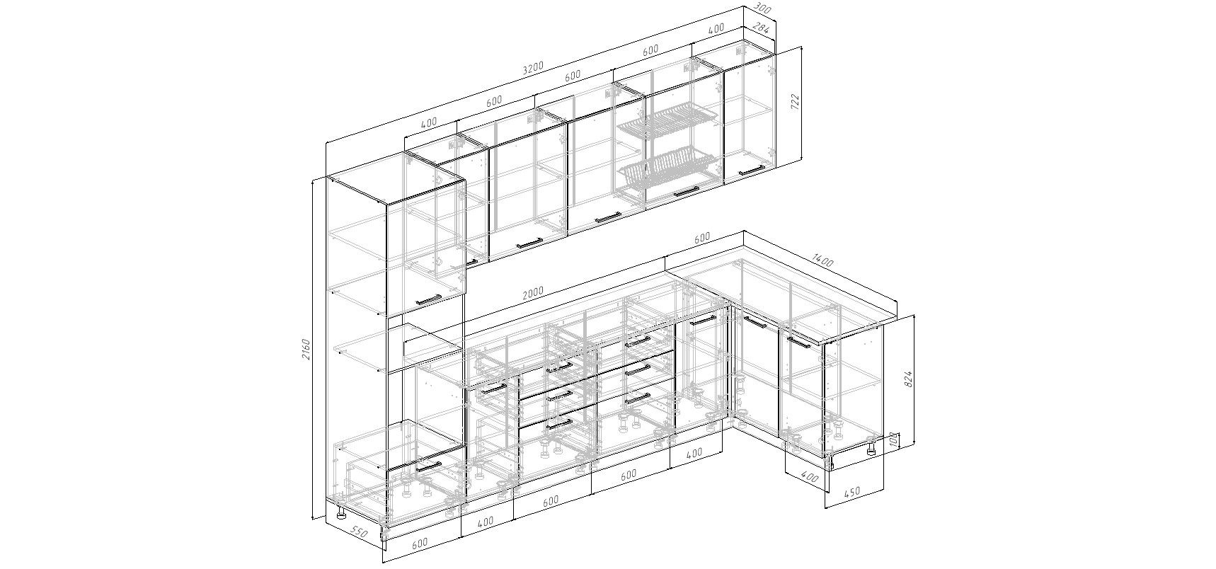 Кухонные модули, цоколь на каждый модуль, посудосушитель, столешница без выпилов, комплект фурнитуры, инструкция по сборке.