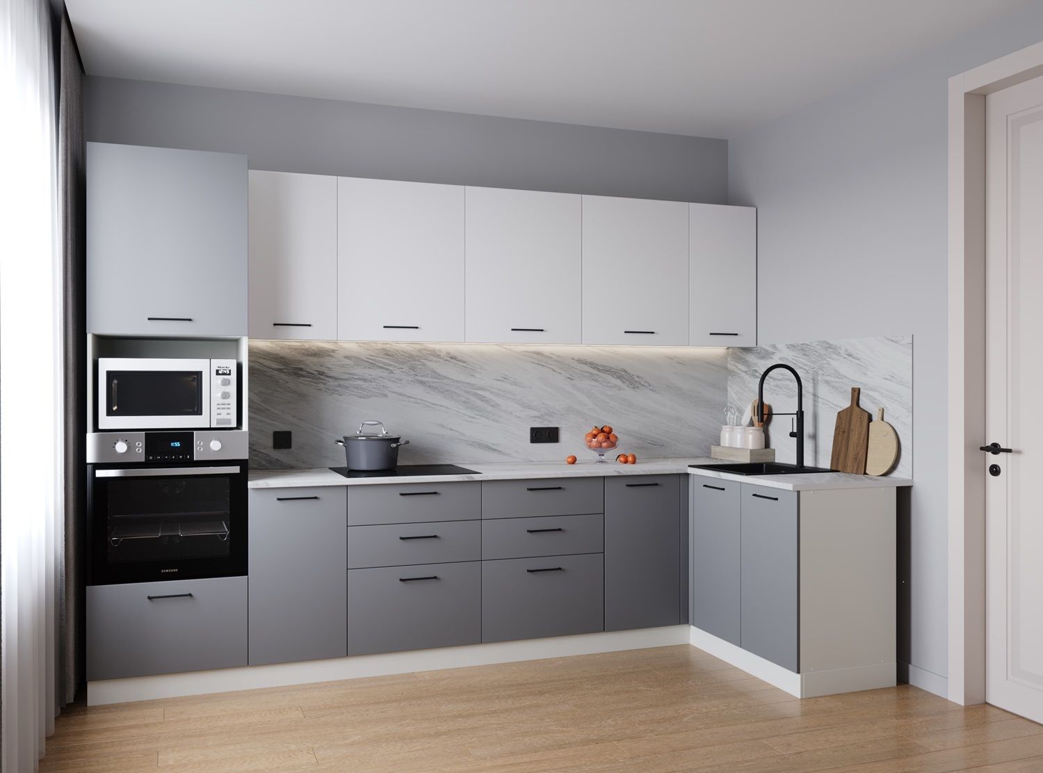 Мойка, смеситель, стеновая панель, бытовая техника в комплект не входят.