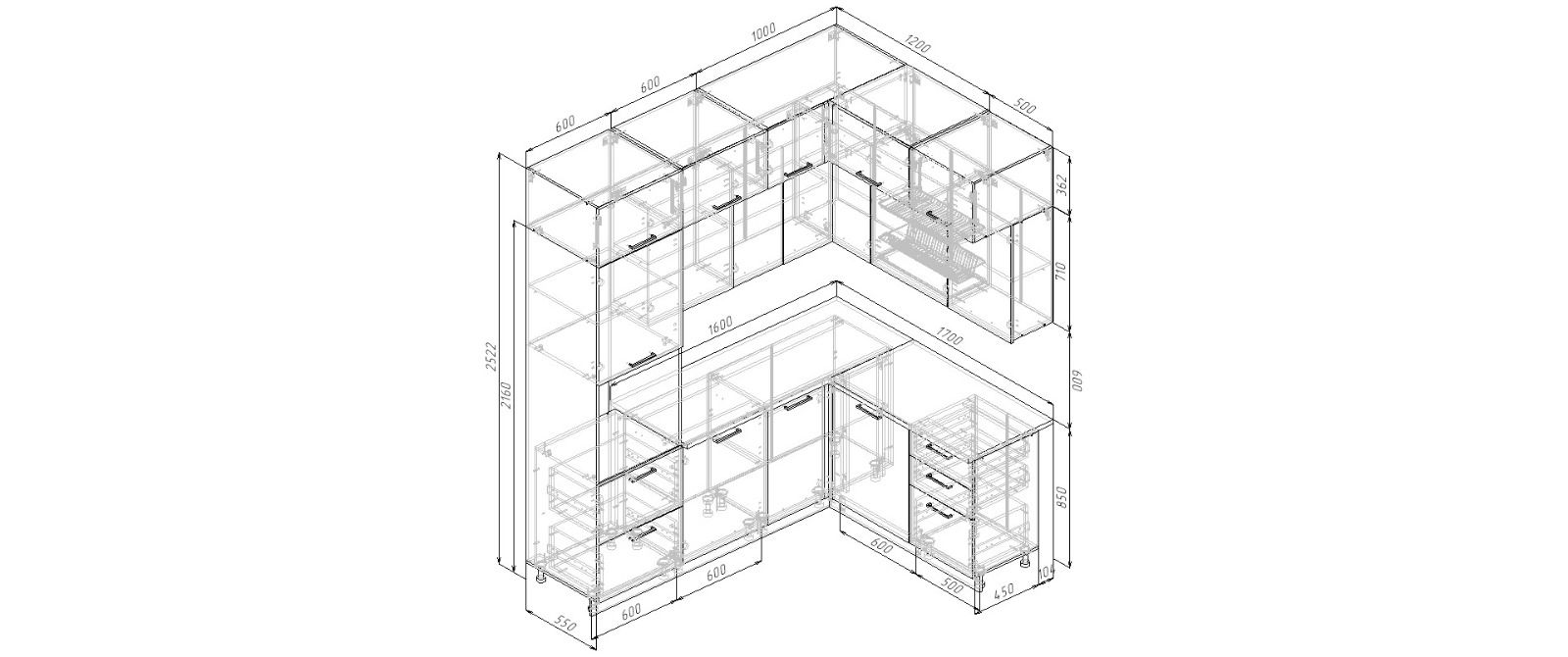 Модули первого верхнего яруса с фасадами со свесом 12 мм, что позволяет открывать их без установленных ручек.