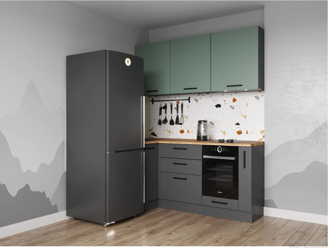 Столешницы цельные со скруглением по переднему краю, пластиковым покрытием и силиконовый капле сборник (защищает фасады нижних модулей от попадания влаги и разбухания);Регулируемые ножки-опоры обеспечивают устойчивость на неровном полу