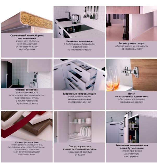 Столешницы цельные со скруглением по переднему краю, пластиковым покрытием и силиконовый каплесборник (защищает фасады нижних модулей от попадания влаги и разбухания);