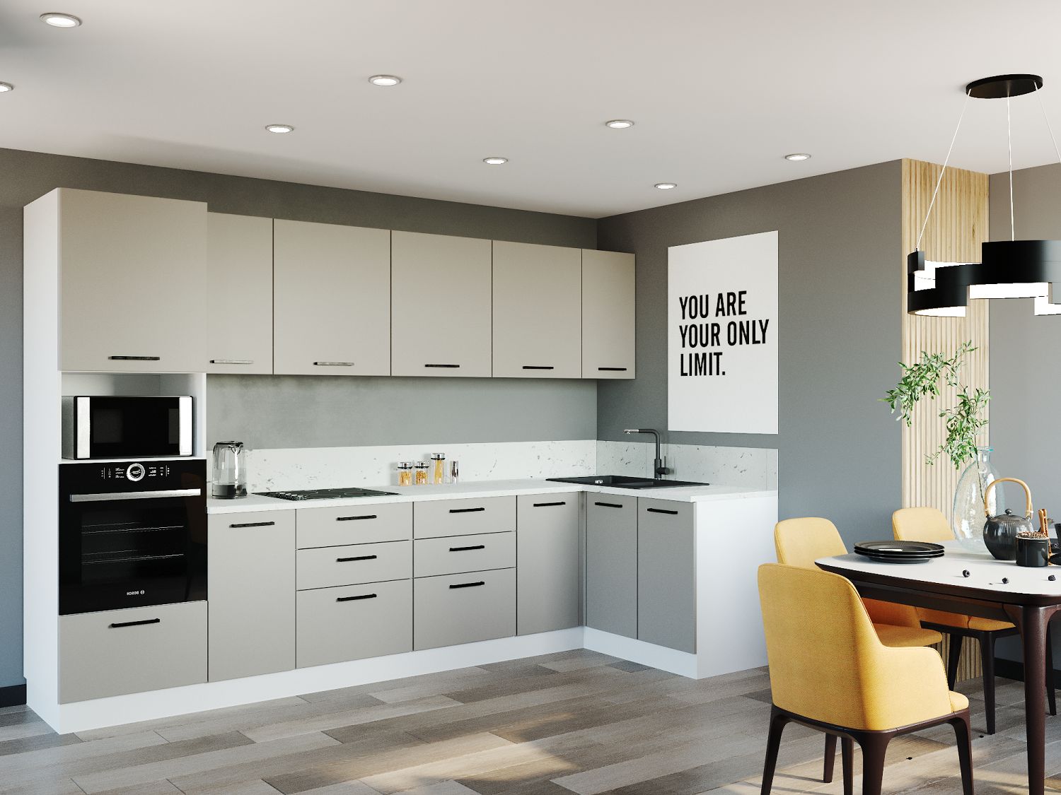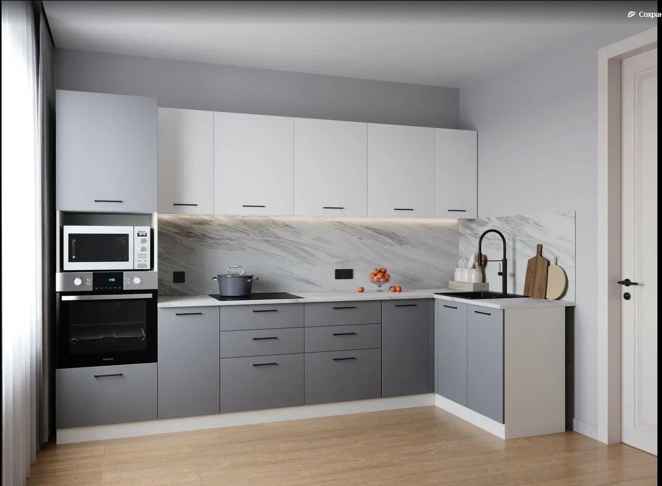 *Мойки, смесители, стеновая панель, бытовая техника в комплект не входят, их необходимо приобрести отдельно. / Вулканический серый ЛДСП/Жемчуг ЛДСП/Вулканический серый ЛДСП / 9403401000 - Мебель деревянная кухонная секционная / 350000 / Элеганция / 38 / Современный