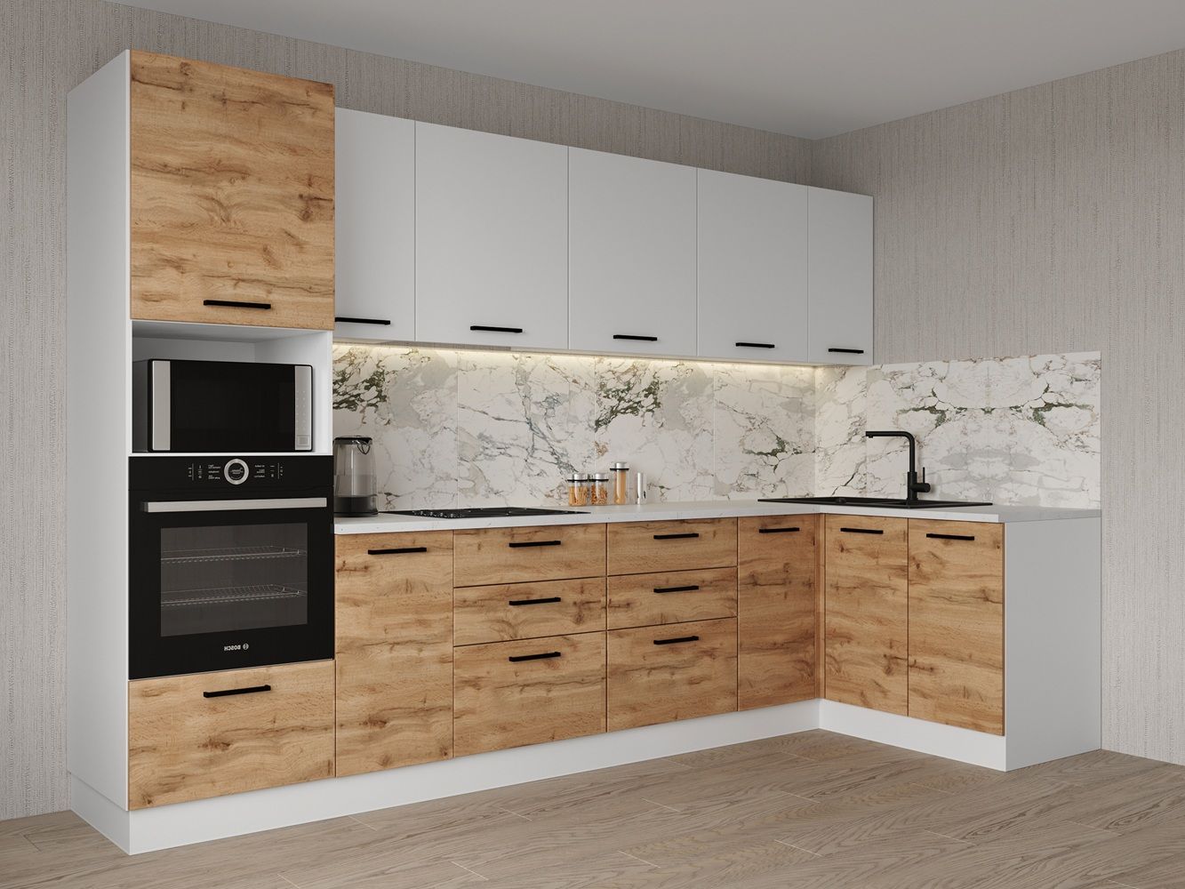 Мойка, смеситель, стеновая панель, бытовая техника в комплект не входят.
