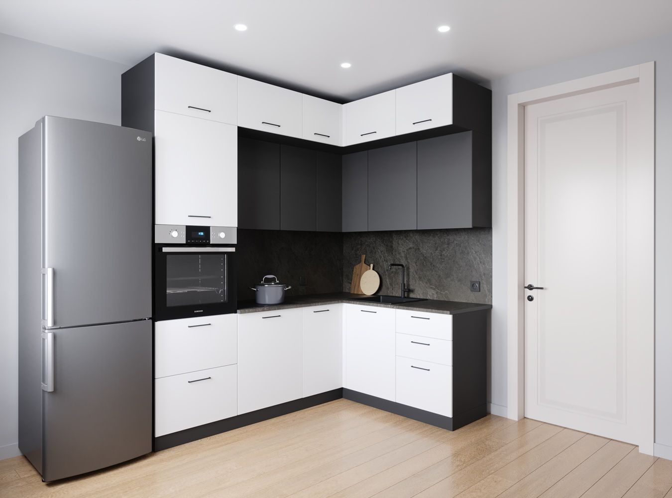 Модули первого верхнего яруса с фасадами со свесом 12 мм, что позволяет открывать их без установленных ручек.