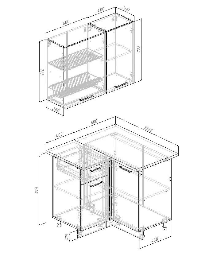 Фасады верхних модулей со свесом 12 мм дают возможность использовать без установки ручек.