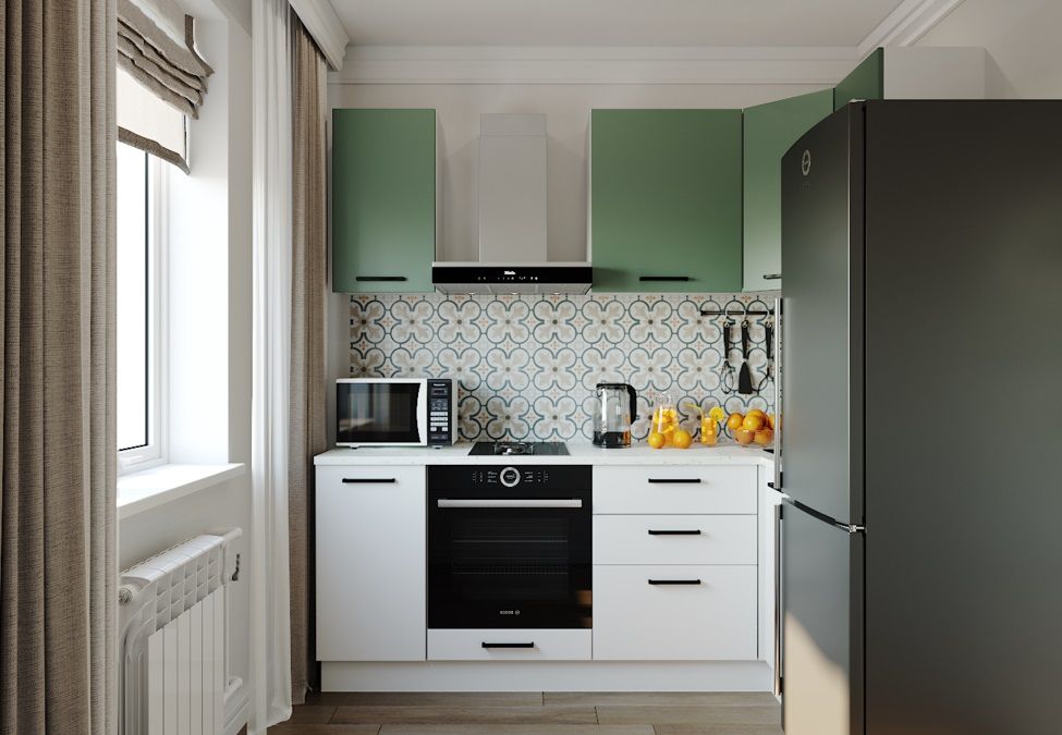 Мойка, смеситель, стеновая панель, бытовая техника в комплект не входят.