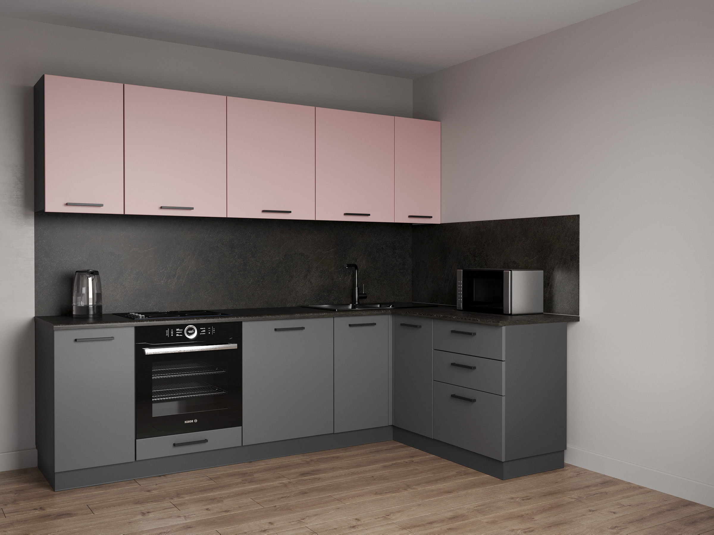 Мойка, смеситель, стеновая панель, бытовая техника в комплект не входят.