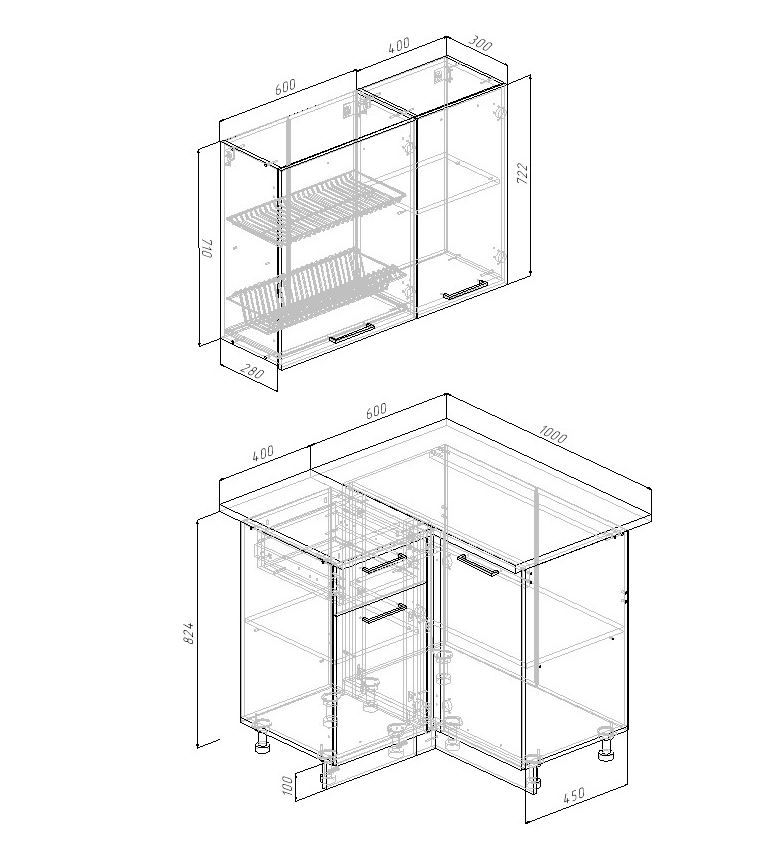 Н100 Модуль нижний угловой (ШхГхВ) 1000х470х824мм - 1шт