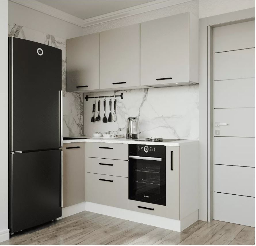 Столешницы цельные со скруглением по переднему краю, пластиковым покрытием и силиконовый капле сборник (защищает фасады нижних модулей от попадания влаги и разбухания);Регулируемые ножки-опоры обеспечивают устойчивость на неровном полу