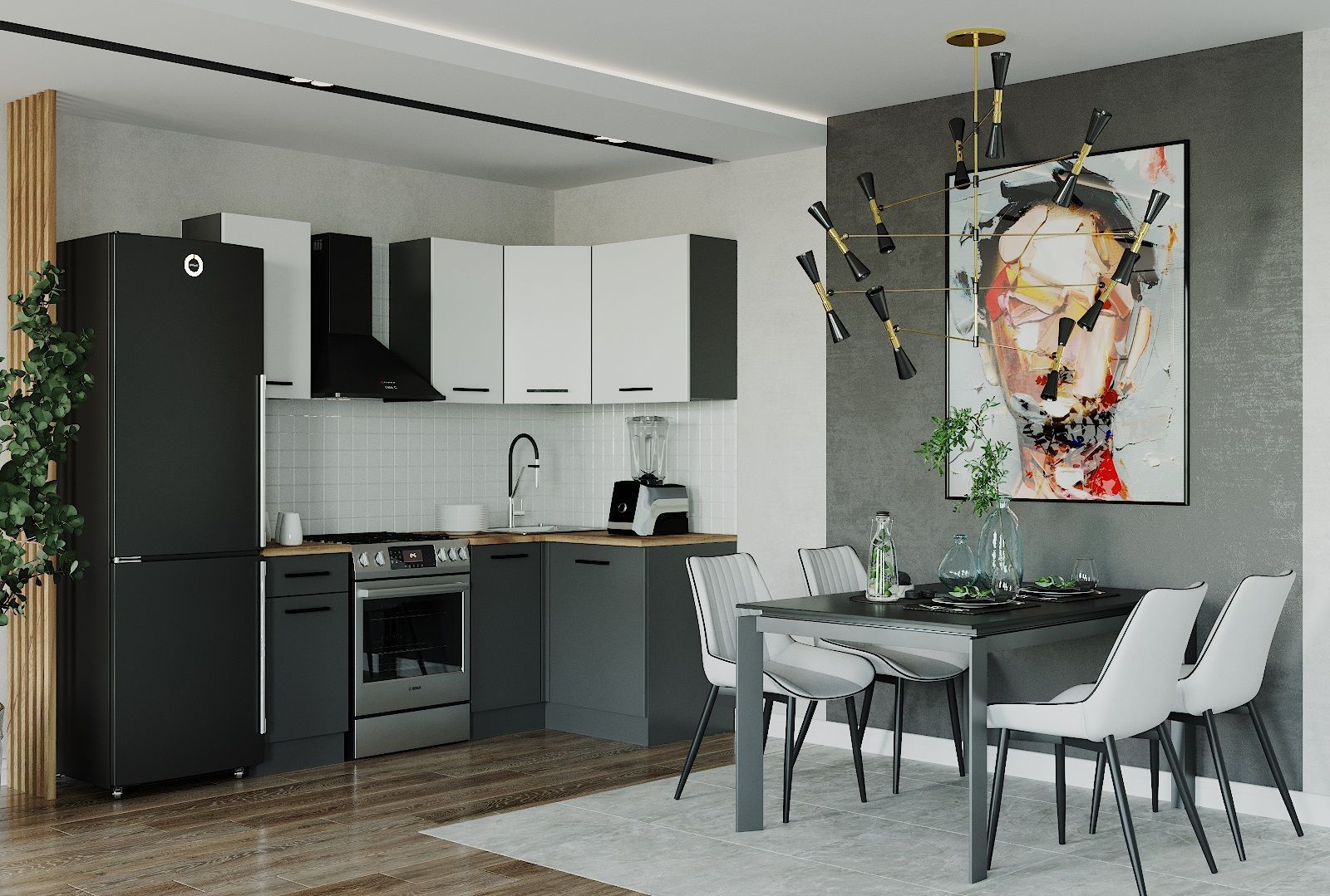 Столешницы цельные со скруглением по переднему краю, пластиковым покрытием и силиконовый капле сборник (защищает фасады нижних модулей от попадания влаги и разбухания);Регулируемые ножки-опоры обеспечивают устойчивость на неровном полу