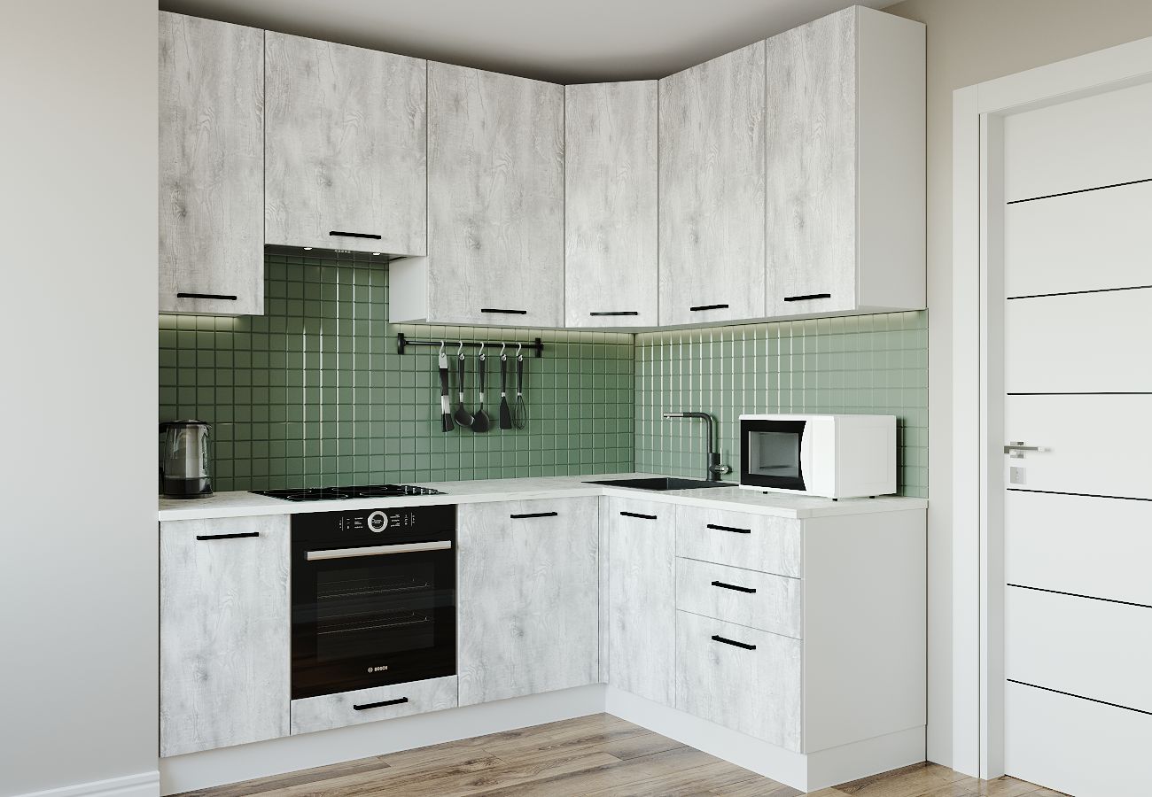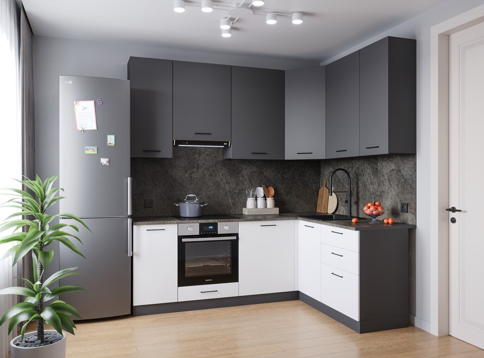 Мойка, смеситель, стеновая панель, бытовая техника в комплект не входят. / Антрацит, Дуб Вотан / Кухня / Антрацит / Выдвижные ящики / Регулируемые ножки