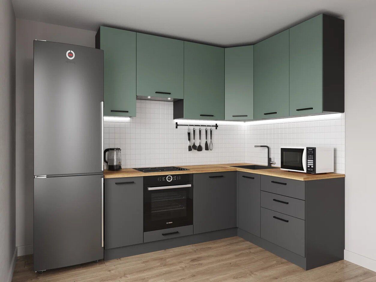 Мойка, смеситель, стеновая панель, бытовая техника в комплект не входят. / Антрацит/Муссон, Дуб вотан / Кухня / Изумруд / Выдвижные ящики / Доводчик
