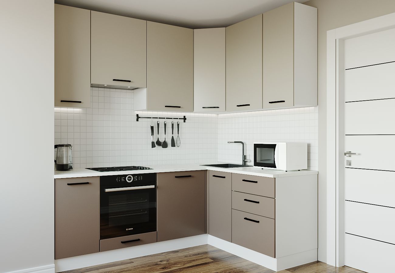 Мойка, смеситель, стеновая панель, бытовая техника в комплект не входят. / Сатин/Мокко / Кухня / Латте / Выдвижные ящики / Регулируемые ножки
