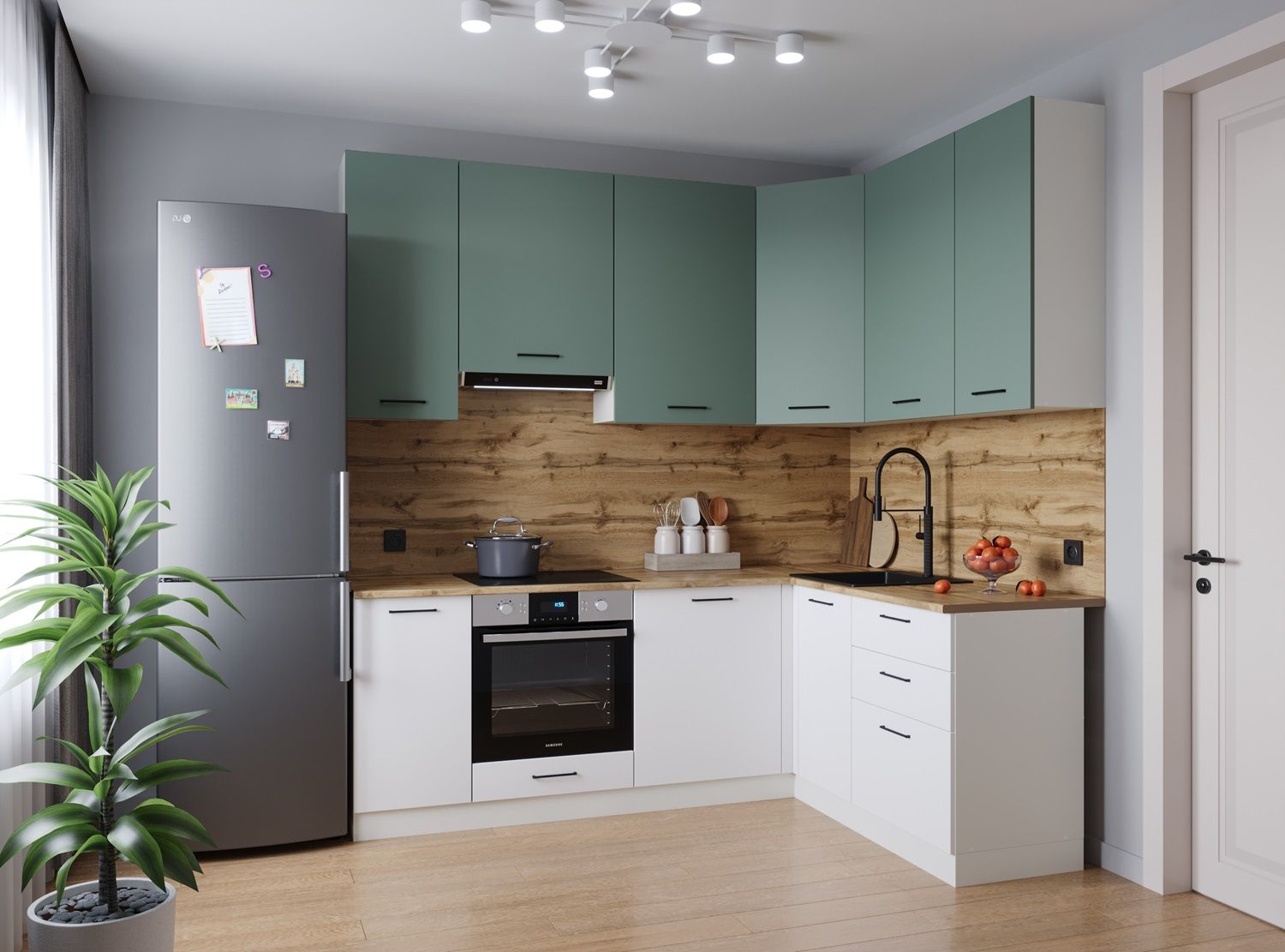 Мойка, смеситель, стеновая панель, бытовая техника в комплект не входят. / Антрацит/Дуб крафт, Дуб Вотан / Кухня / Дели / Выдвижные ящики / Регулируемые ножки
