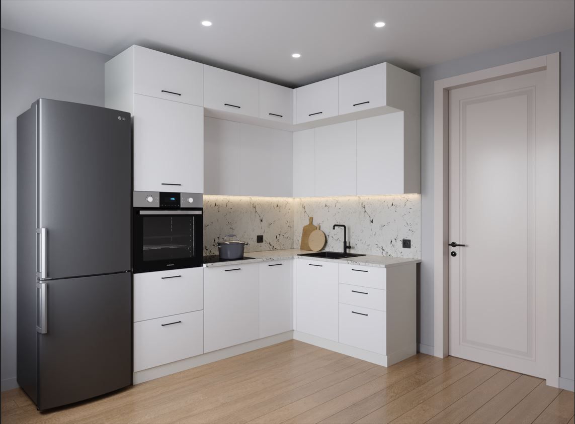 Модули первого верхнего яруса с фасадами со свесом 12 мм, что позволяет открывать их без установленных ручек.