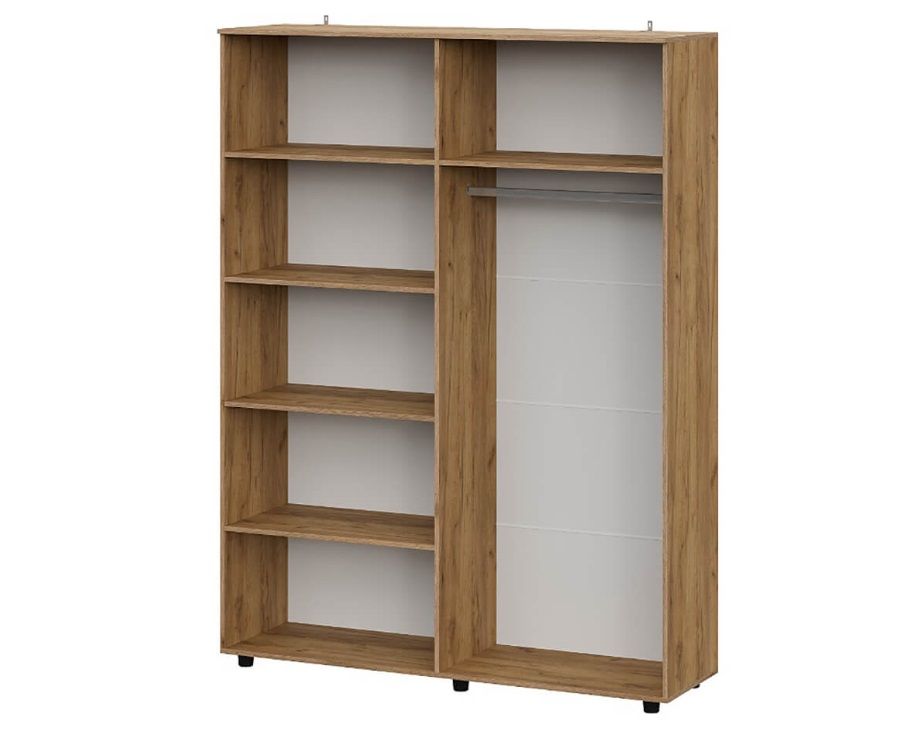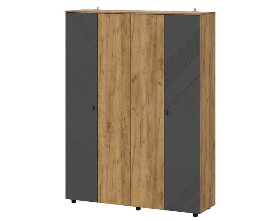 - Продуманная конструкция: Четырехстворчатый распашной шкаф обеспечивает удобный доступ ко всем вещам. Слева — отсек с 4 просторными полками, справа — отделение со штангой для платьев, рубашек и пиджаков (обратите внимание: присадка под штангу отсутствует, покупатель легко устанавливает ее самостоятельно).