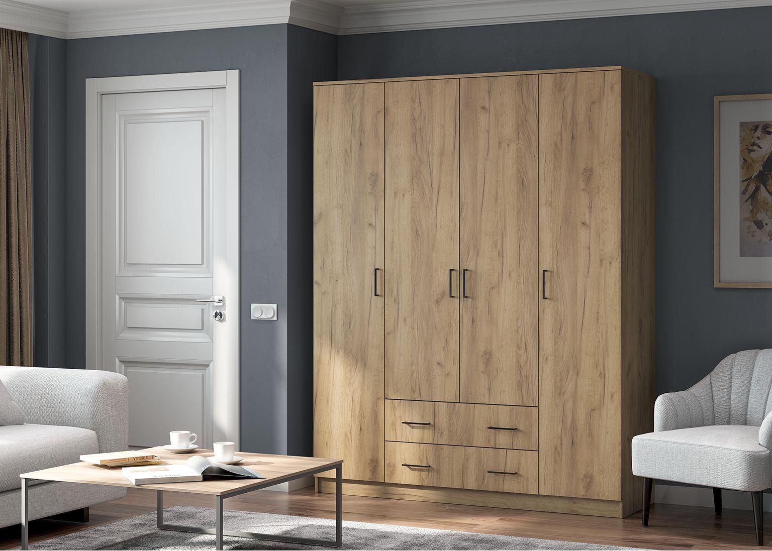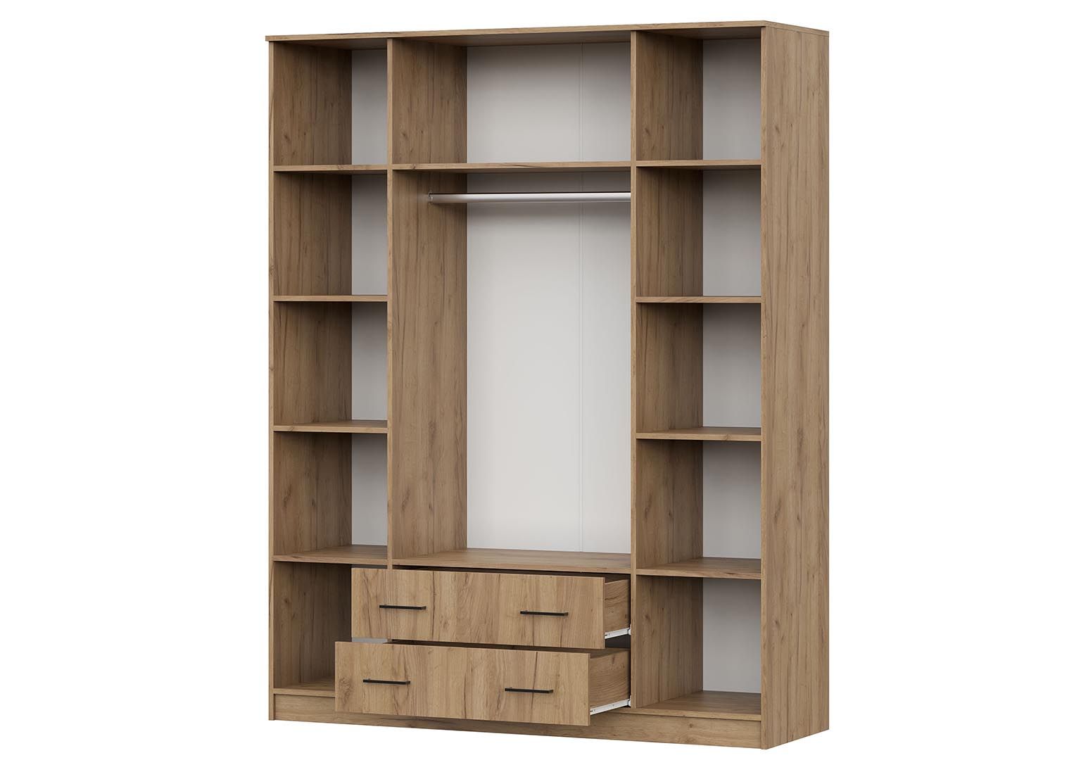 - Посередине отделение шириной 768 мм. В нижней части отделения расположена секция с двумя выдвижными ящиками, в верхней — платяное отделение высотой 1512 мм с одной полкой сверху и металлической штангой.