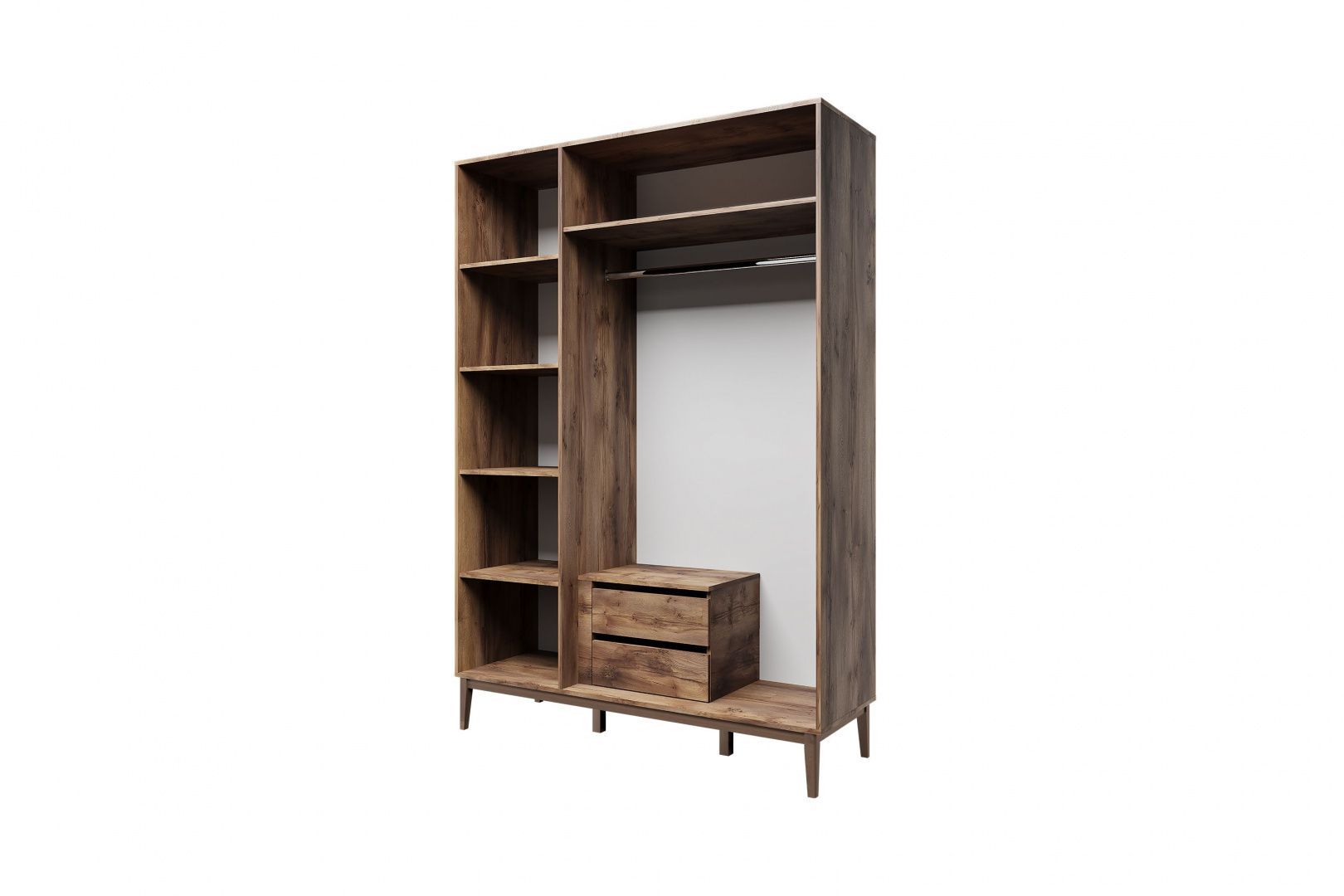 Шкаф с фрезерованными фасадами имеет две секции. За средней и правой дверью расположена секция со штангой и двумя выдвижными ящиками. За левой дверью располагаются четыре полки для белья. Петли с доводчиками, шариковые направляющие полного выдвижения.