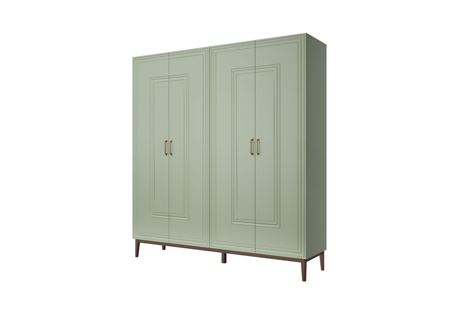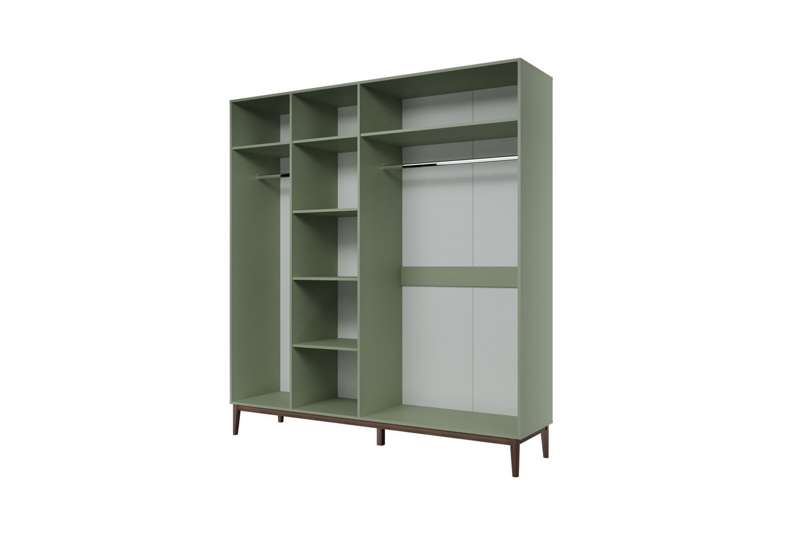 Шкаф с фрезерованными фасадами имеет две секции. За правой секцией расположена штанга и верхняя полка. За левой секцией располагается штанга с верхней полкой, а также четыре полки для белья.