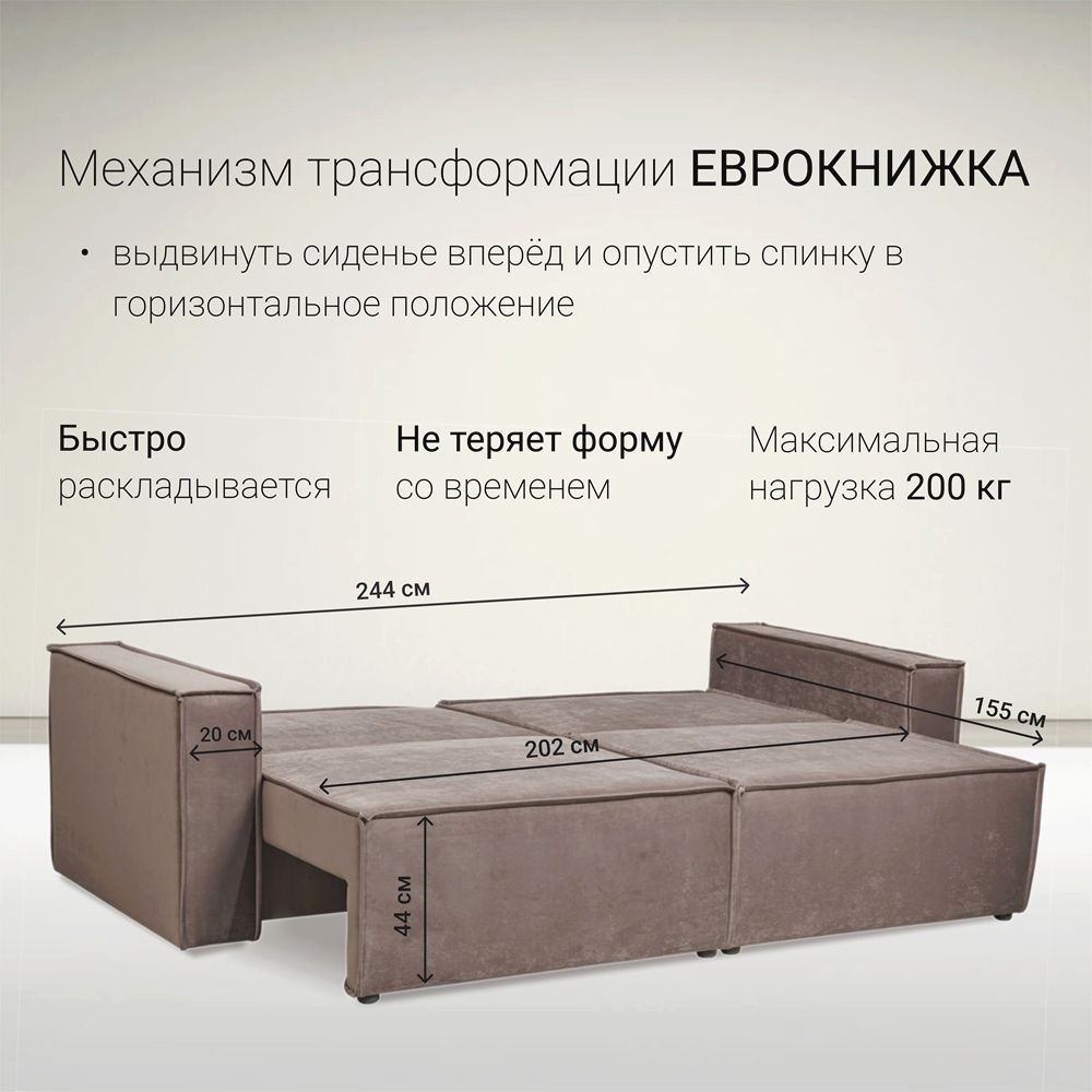 Диван оснащен проверенным механизмом трансформации «Еврокнижка». Просто потяните сиденье на себя – и перед вами полноценное спальное место с ровной поверхностью. Механизм прост в использовании и рассчитан на долгие годы службы.